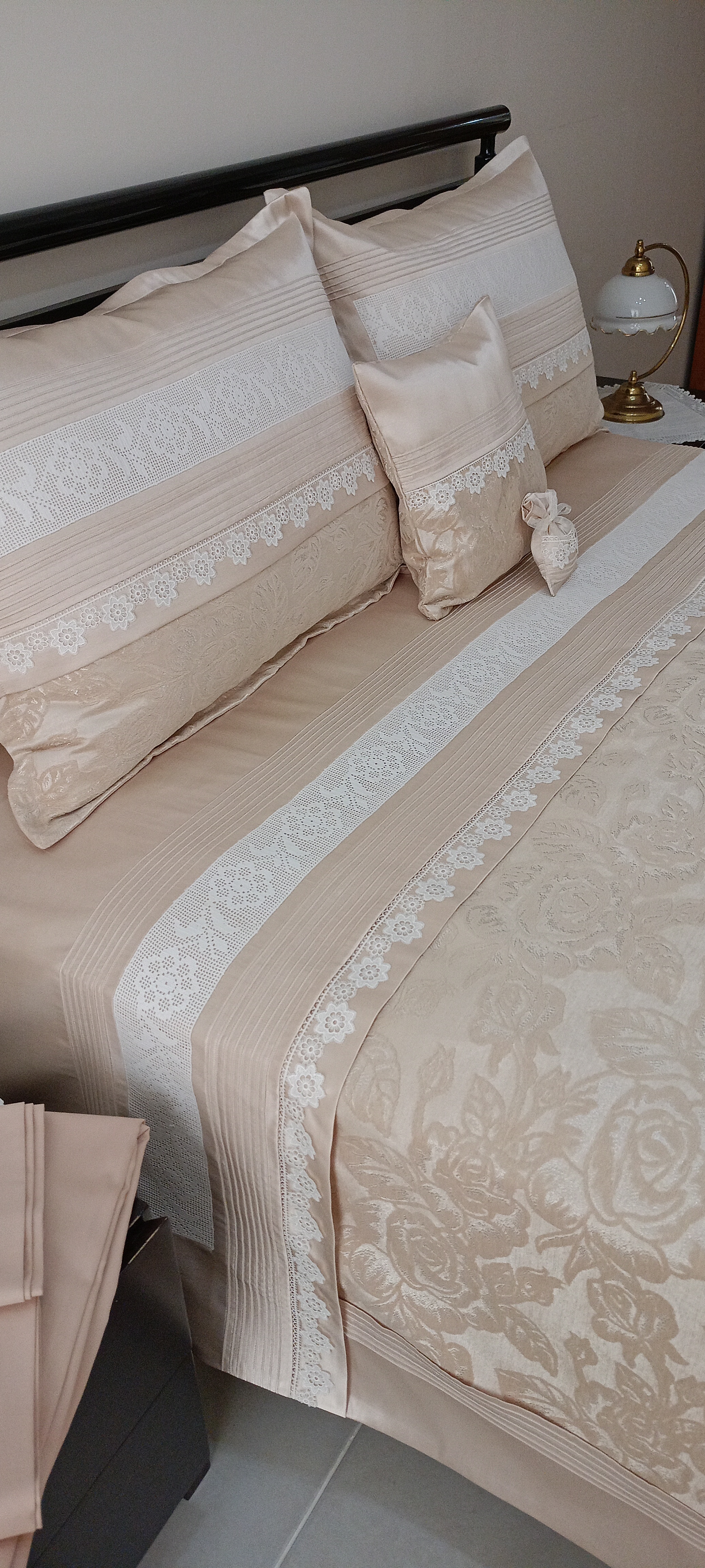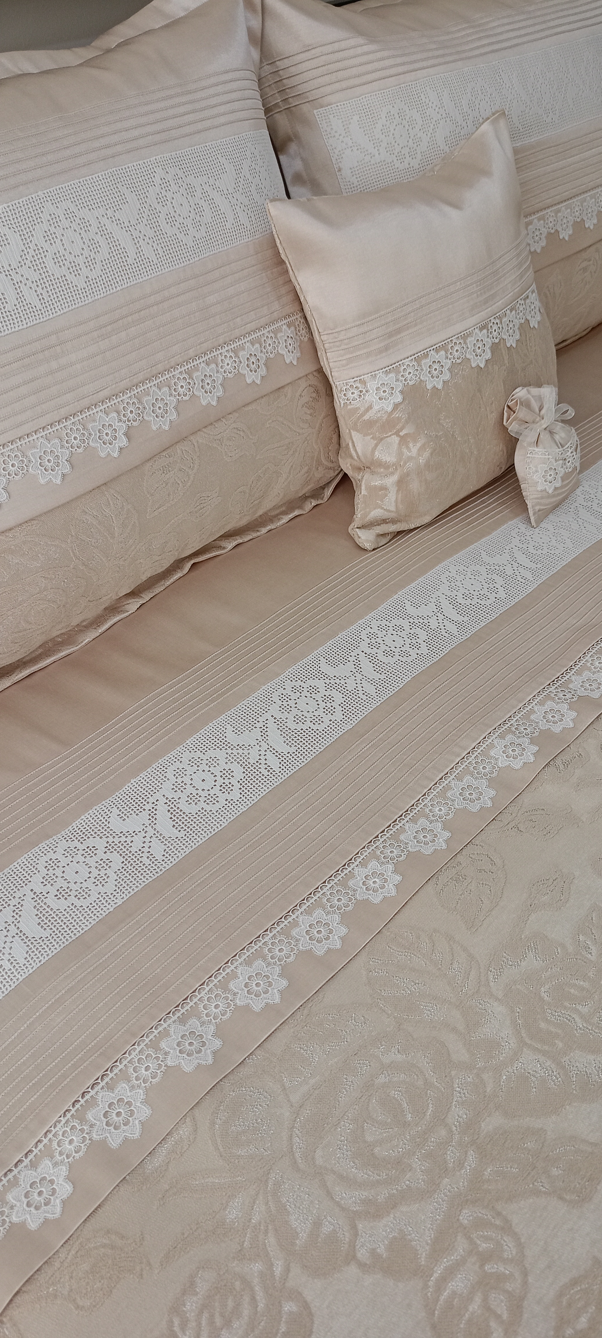 Şönil Kadife Pikelik Kumaş Kullanılmıştır. Çarşaf ve Yastık kılıflarında %100 Merserize Pamuk Saten Kullanılmıştır. Küpürler ile süslenmiştir. El Örmesi Dantel Değişiklik arz edebilir. El Örmesi Dantel kullanılmıştır. Sizin elinizdeki El Örmesi Dantel de değerlendirilebilir. Ölçüler; 250x255 pike 60x80 2 adet Volanlı Kırlent (50x70 yastık uyumludur) 50x70 2 adet Uyku Yastığı 30x50 Süs Yastığı 160x200 yatağa uyumlu lastikli çarşaf Sadece Kılıf Mevcuttur. Yastık Dolgusu Dahil Değildir. 30 derecede narin yıkama yapılabilir.