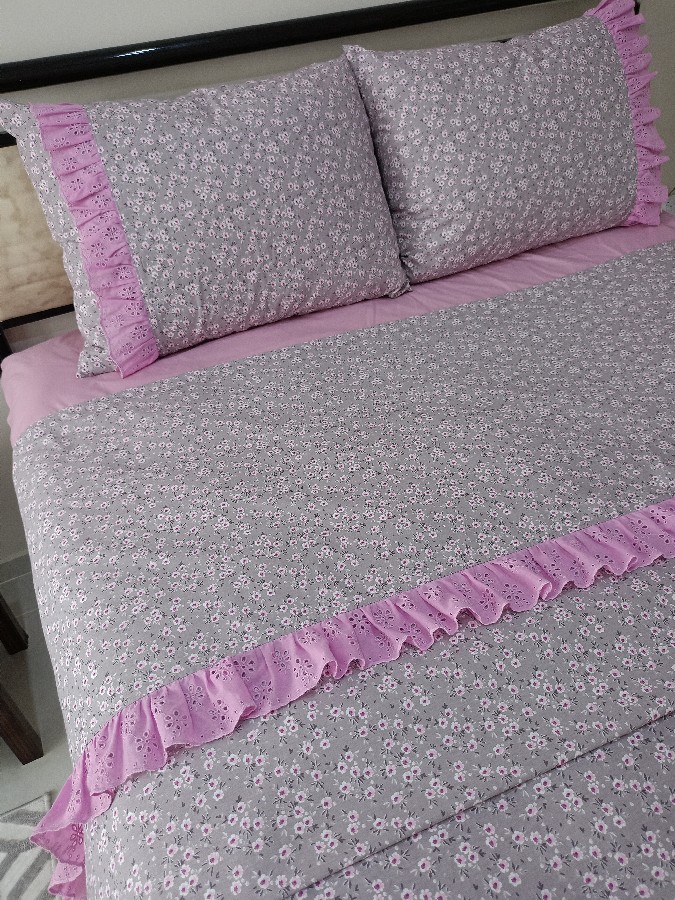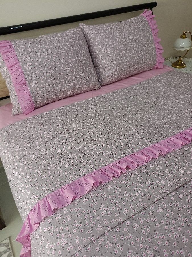 yüzde yüz pamuk kumaştan dikilmiştir fisto fırfırlarla süslenmiştir iki yastık lastikli çarşaf ve nevresim olmak üzere dört parçadan oluşur istenirse iki yastık daha ilave edilebilir nevresim 200*220 yastıklar 50*70 çarşaf 160-200 uyumlu lastikli çarşaftır 30 derecede yıkanır solma çekme yapmaz