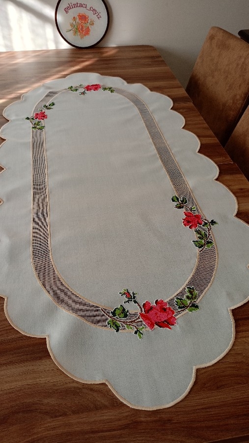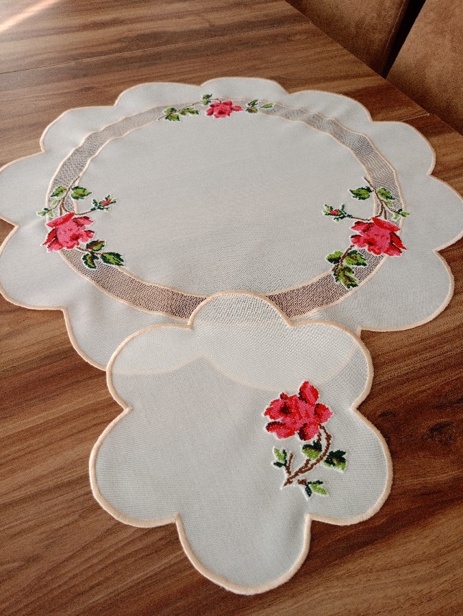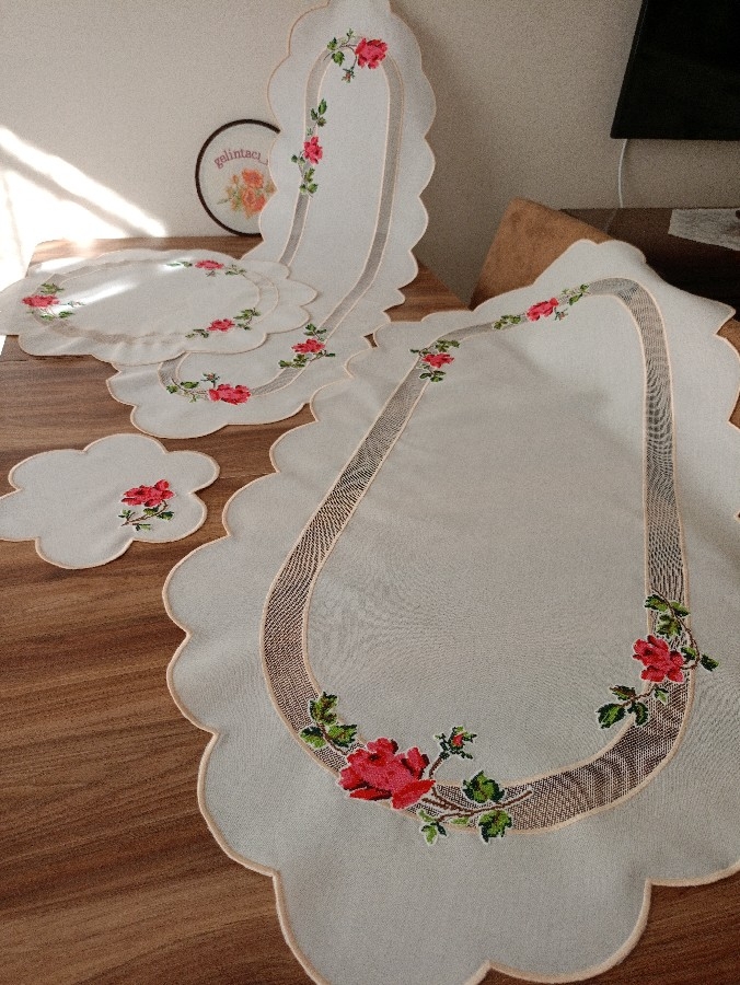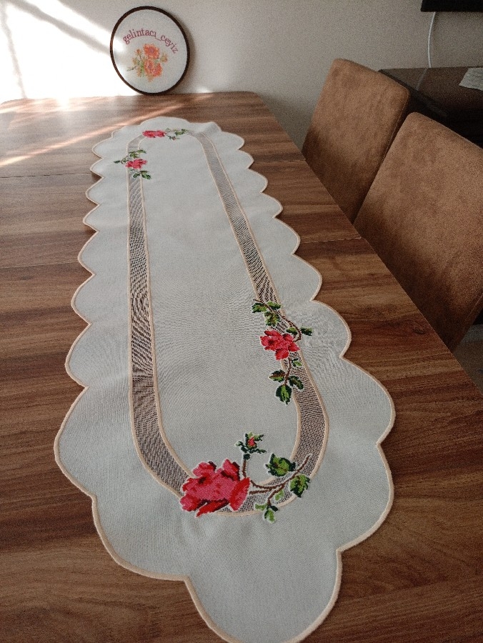 Dört parçadan oluşmaktadır.Nicea keten leke tutmaz kumaş kullanılmıştır. Ankara tülü kullanılarak kaneviçeler farklı bir tasarım uygulanmıştır. Masa ranırı 60*130, konsol ranır 35*130, orta sehpa ranırı 50*90, zigon sehpa ranırı 40*40 Kaneviçesi değişiklik gösterebilir.