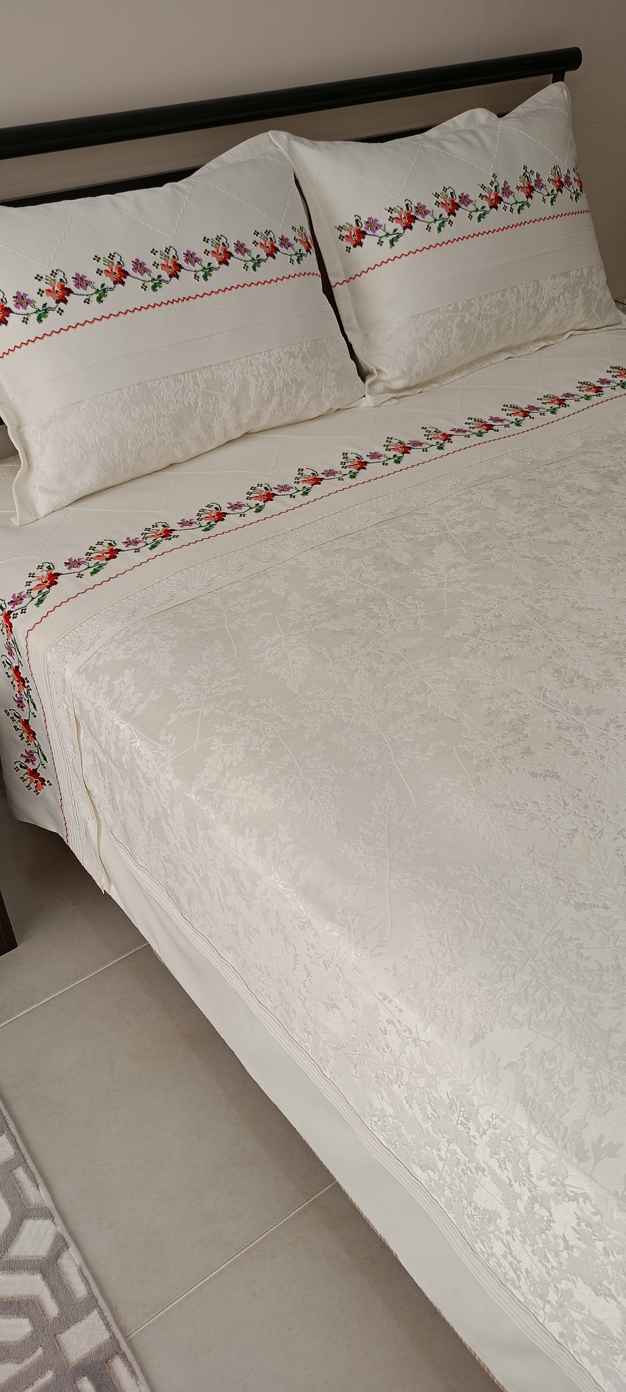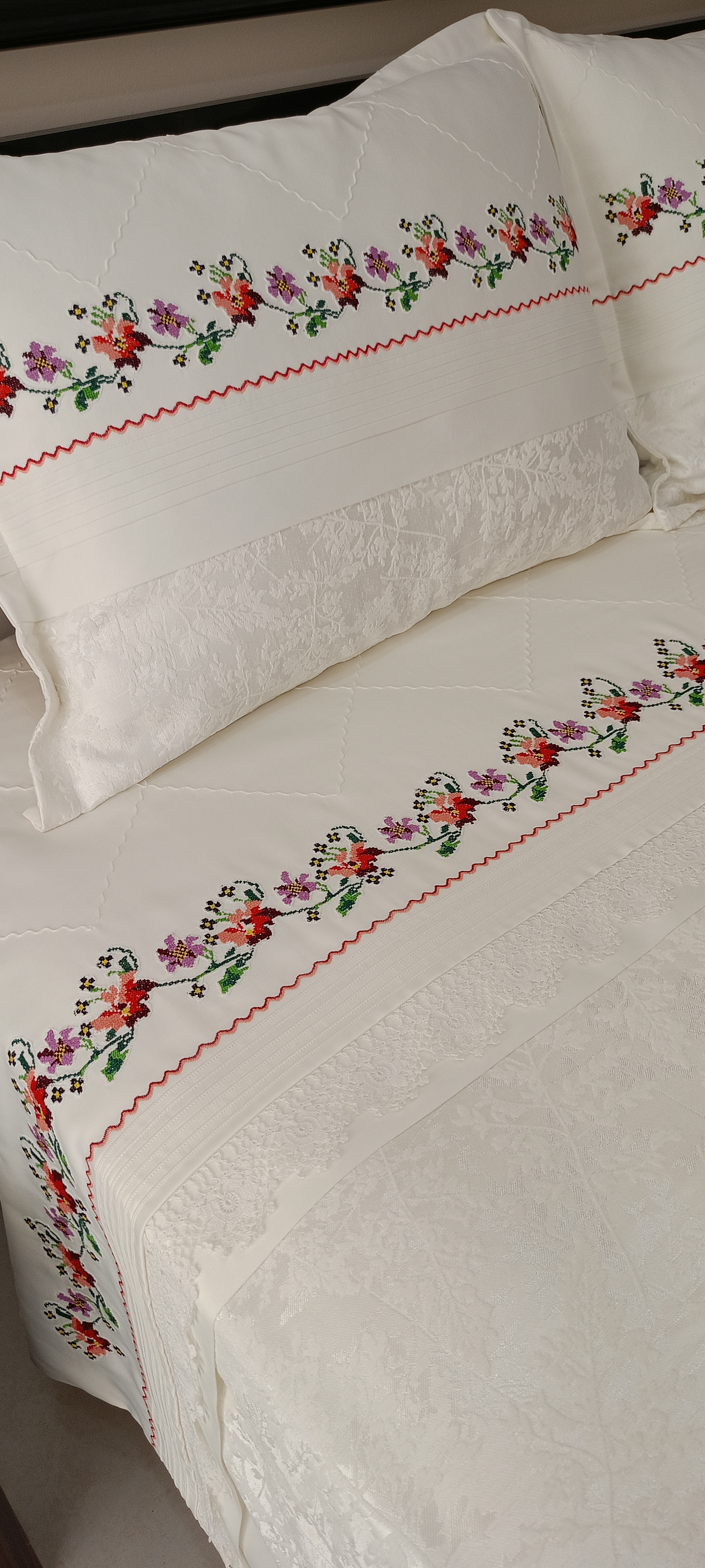 Şönil Kadife Pikelik Kumaş Kullanılmıştır. Çarşaf ve Yastık kılıflarında %100 Merserize Pamuk Saten Kullanılmıştır. Küpürler ile süslenmiştir.Dantel ve kaneviçesi Değişiklik arz edebilir. El Örmesi Dantel ve el işi kaneviçe kullanılmıştır. Sizin elinizdeki El Örmesi Dantel ve kaneviçe de değerlendirilebilir. Ölçüler; 250x255 pike 60x80 2 adet Volanlı Kırlent (50x70 yastık uyumludur) 50x70 2 adet Uyku Yastığı 160x200 yatağa uyumlu lastikli çarşaf Sadece Kılıf Mevcuttur. Yastık Dolgusu Dahil Değildir. 30 derecede narin yıkama yapılabilir.