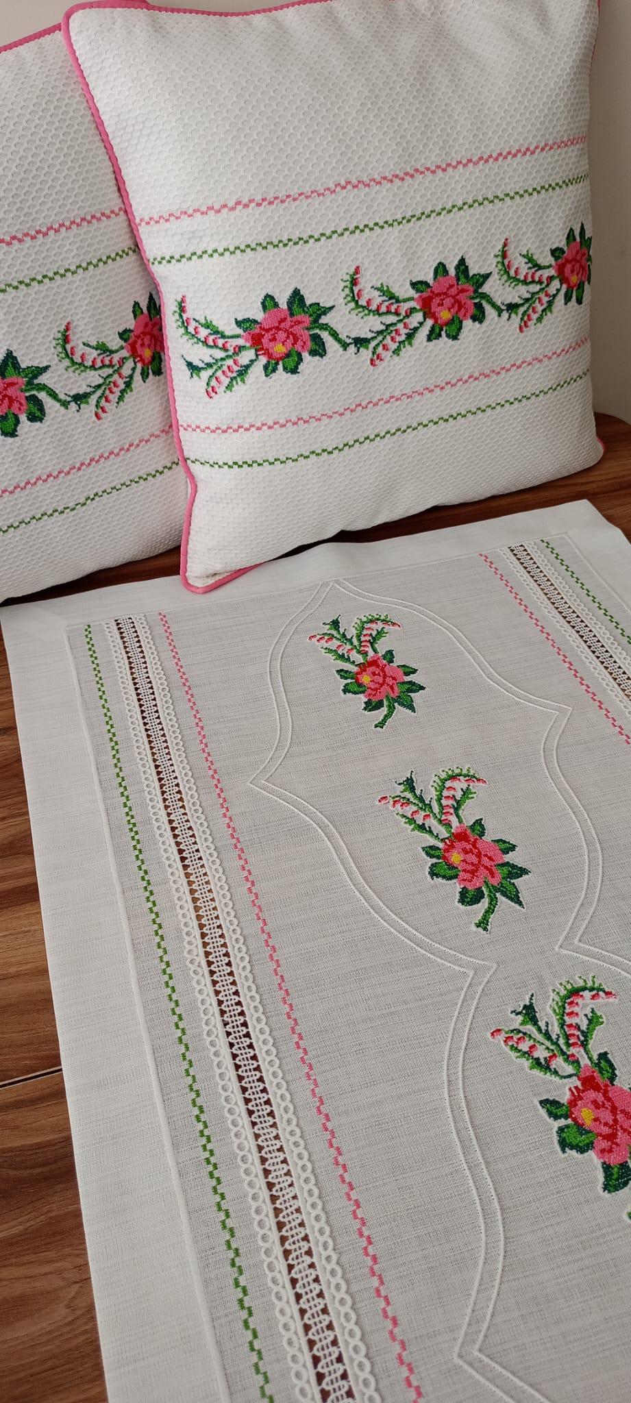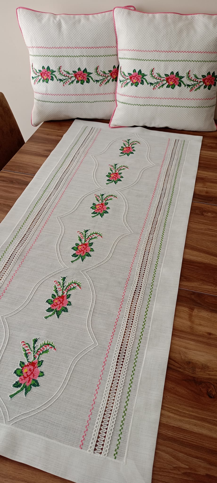 Kaneviçe ve küpür ile detaylandırılmıştır. Gardenya keten kullanılarak yapılmıştır. Ranırı 55*125 cm dikdörtgen ebatındadır. KIrlentleri 45*45 pikelik kumaş kullanılarak dikilmiştir.Kaneviçe ve küpür değişiklik gösterebilir. Evlerinizi renklendirir. 30 derecede narin yıkama yapılır.