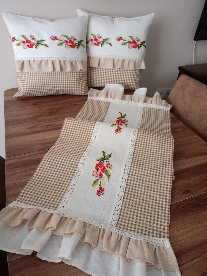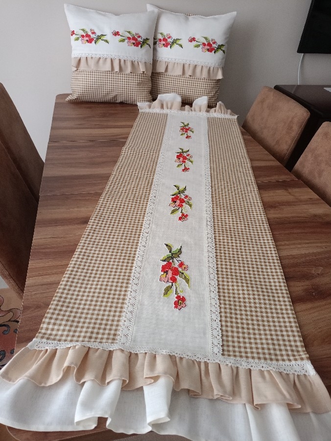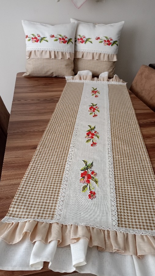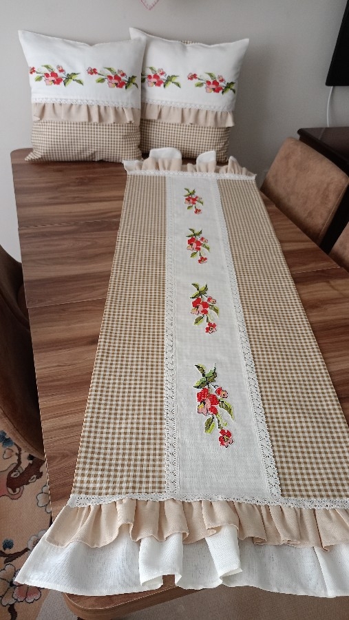 üçlü balkon takımı ister balkonda ister evinizde nerde kullanırsanız oraya şıklık getirir... 45*45 iki adet kırlent 50-125 Runner Duck keten (su itici) kumaş kullanılmıştır. Leke tutmaz kırışmaz. 30 derece yıkamaya uygundur. iç dolgusu dahil değildir istenirse ilave edilebilir. Kanaviçesi değişiklik gösterebilir.