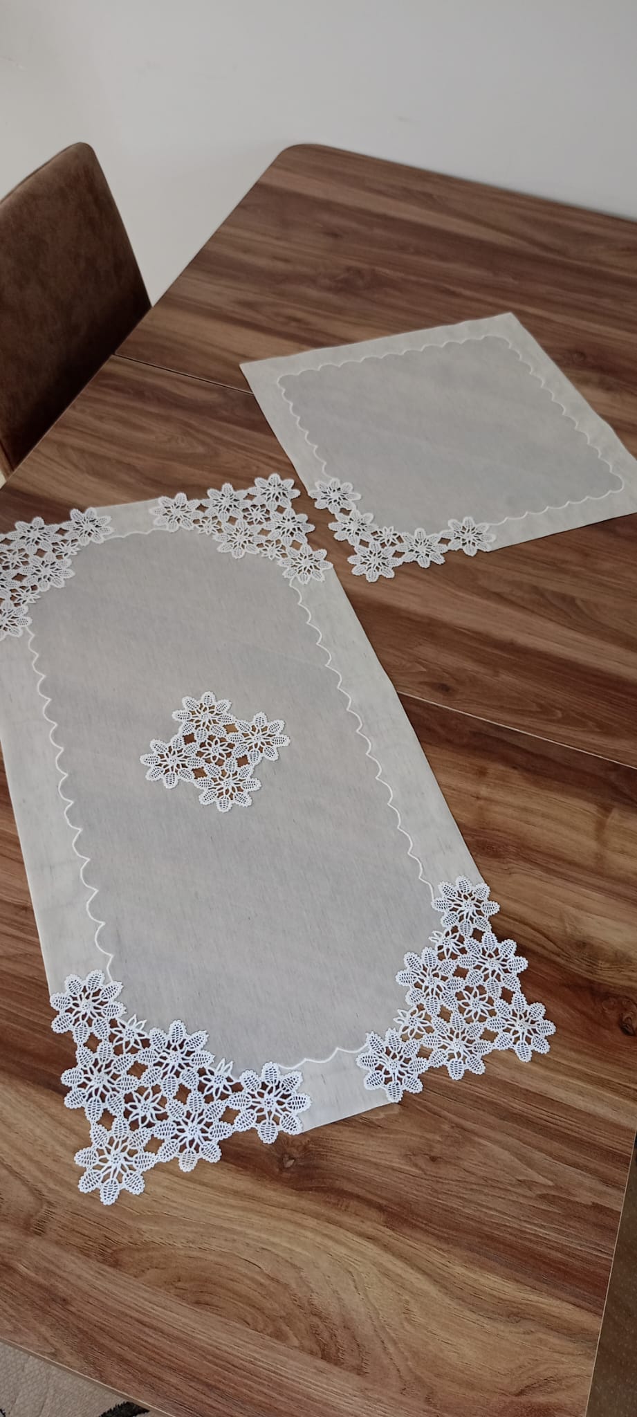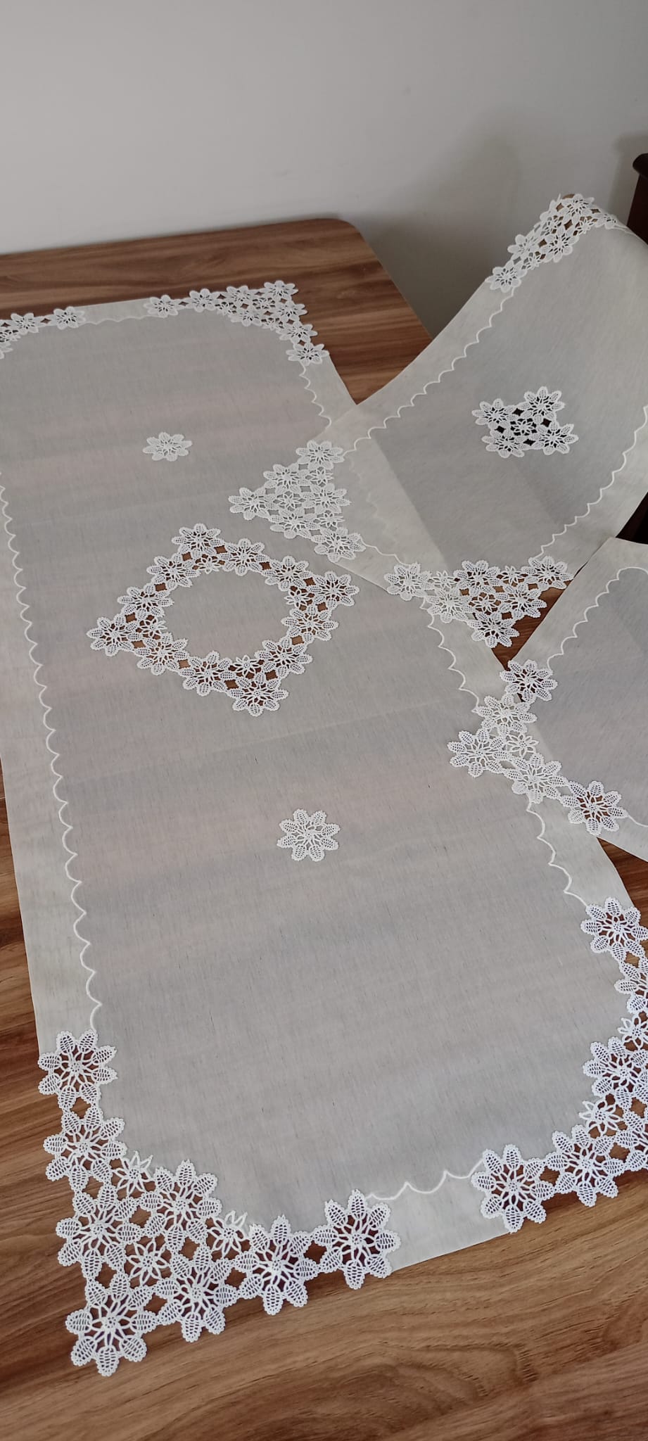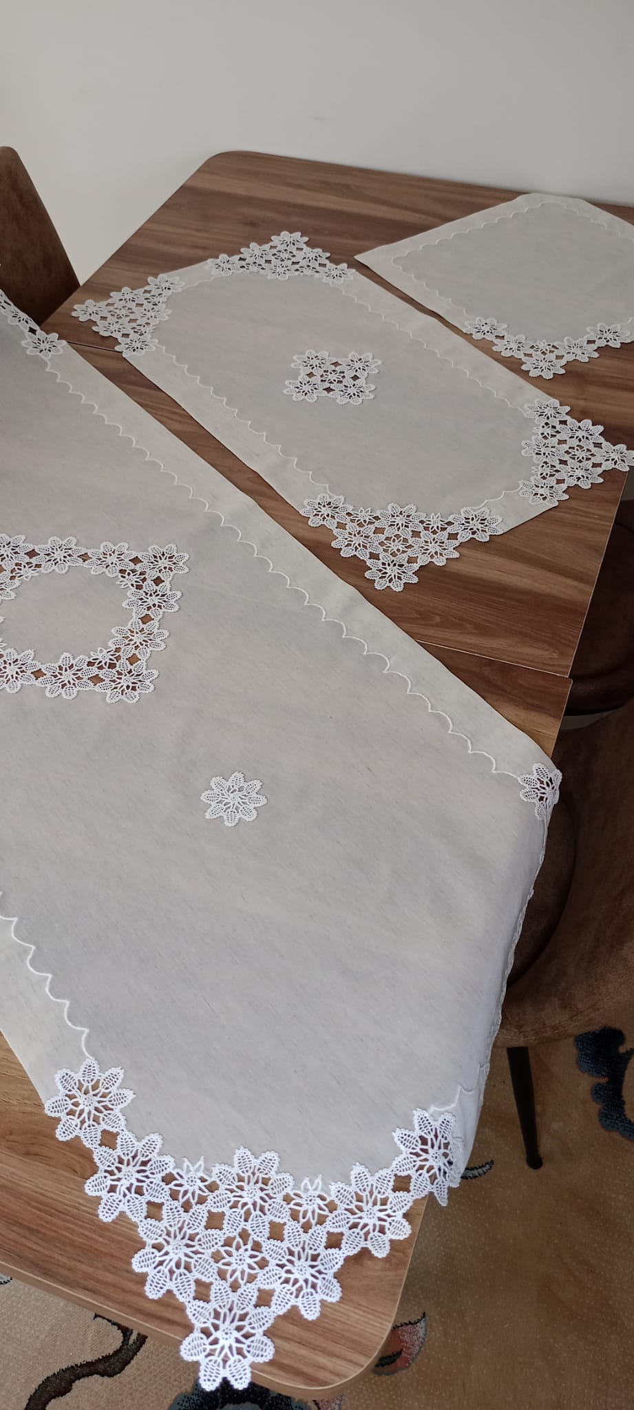Üç parçadan oluşmaktadır. İsveç Keteni leke tutmaz kumaş kullanılmıştır. Dantel kullanılarak nervür ile detaylandırılmıştır. Masa ranırı 55*125, orta sehpa ranırı 50*90, zigon sehpa ranırı 40*40'tır. Danteli değişiklik gösterebilir.