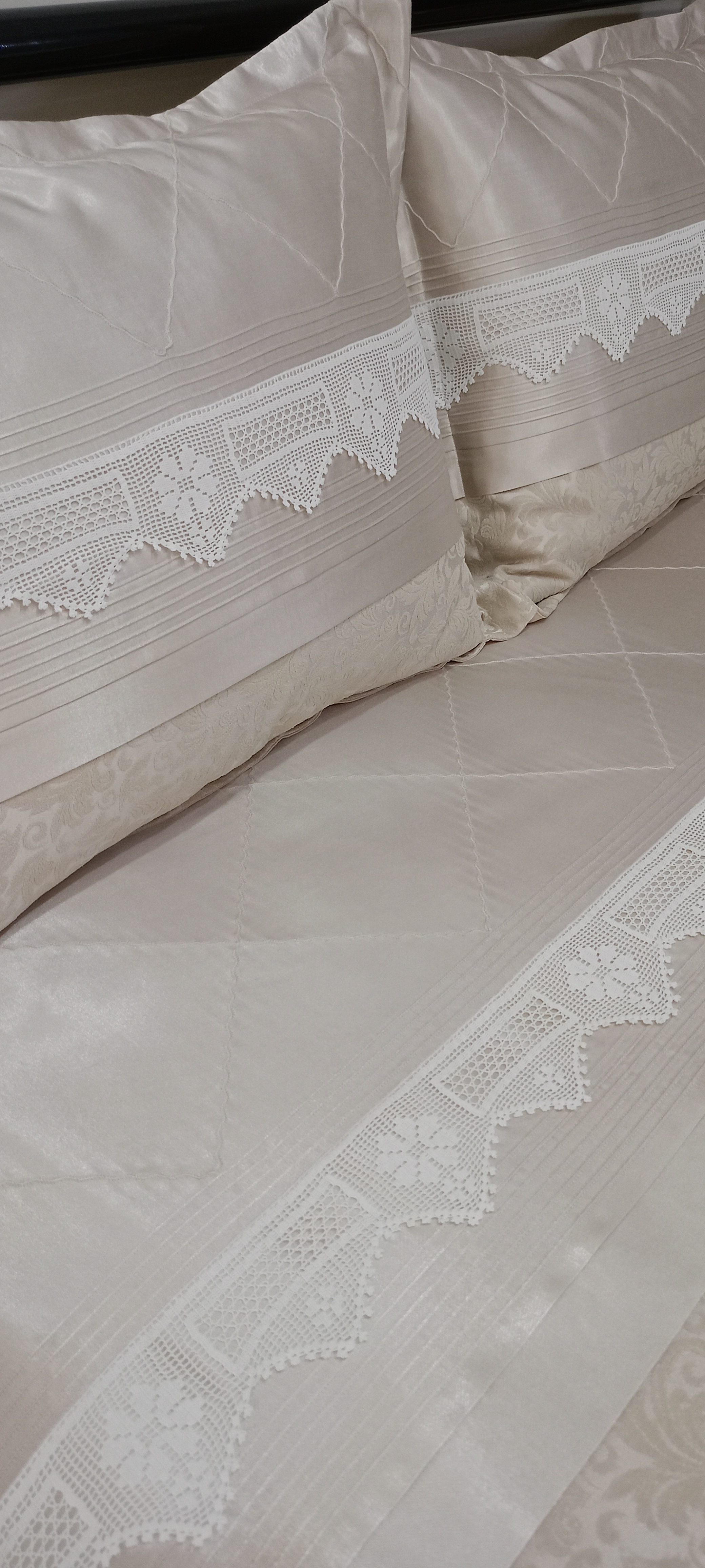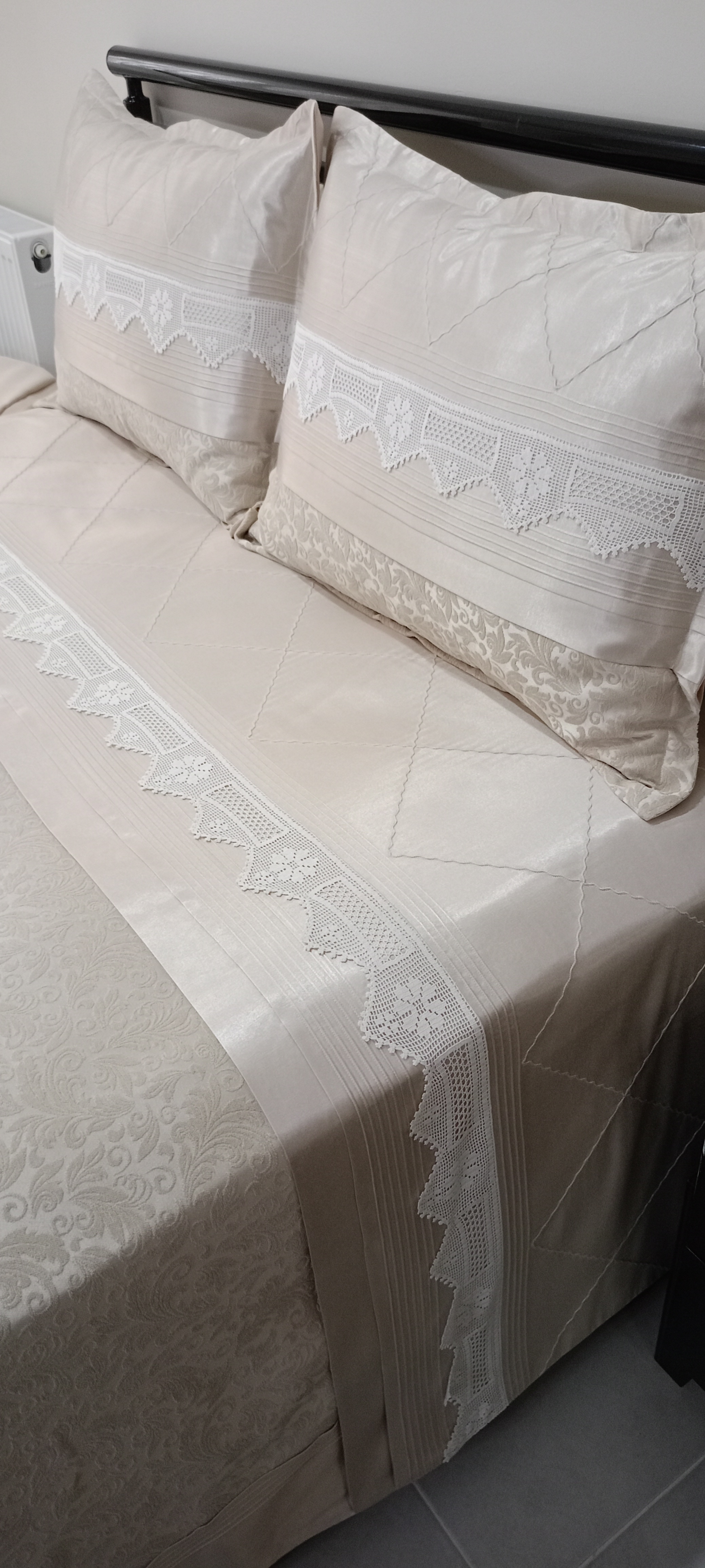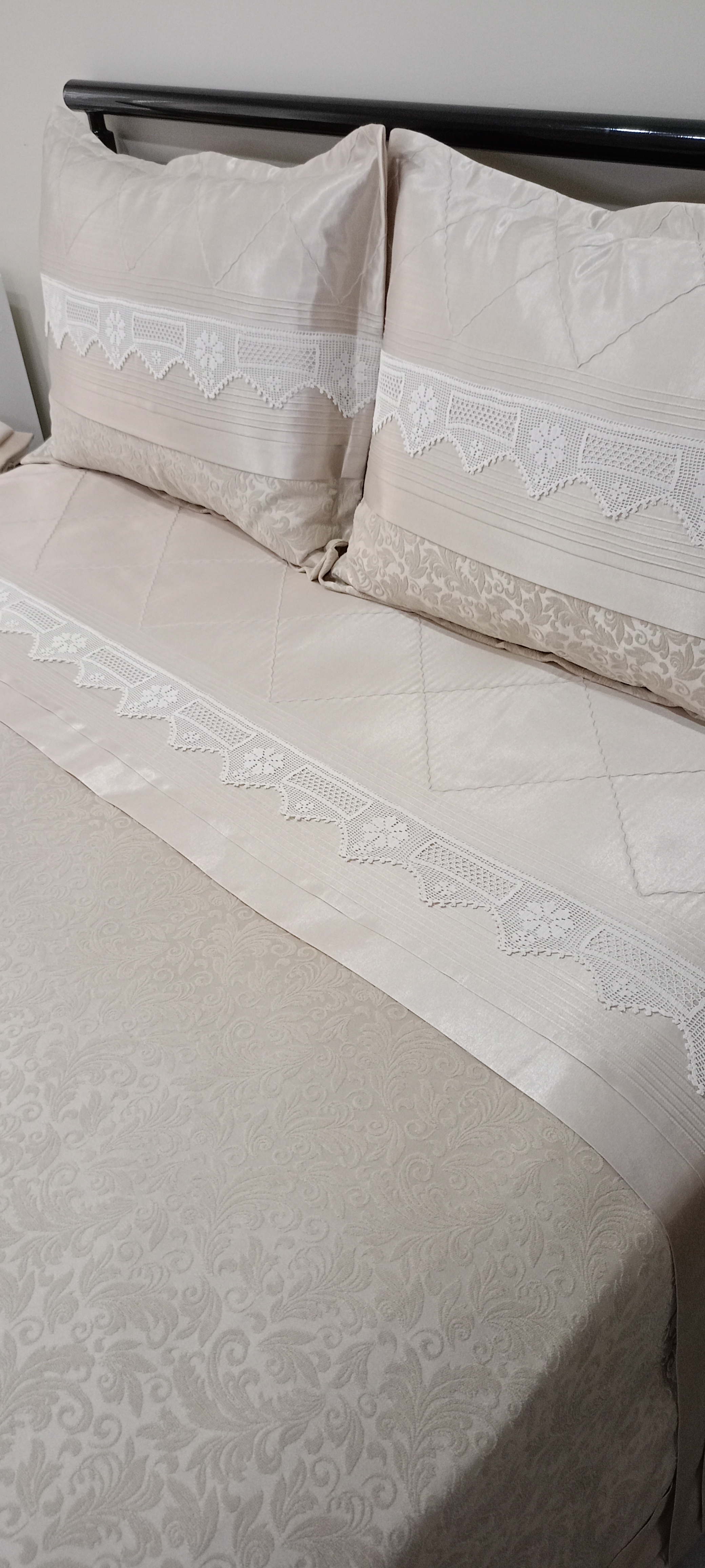 Şönil Kadife Pikelik Kumaş Kullanılmıştır. Çarşaf ve Yastık kılıflarında %100 Merserize Pamuk Saten Kullanılmıştır. Küpürler ile süslenmiştir. El Örmesi Dantel Değişiklik arz edebilir. El Örmesi Dantel kullanılmıştır. Sizin elinizdeki El Örmesi Dantel de değerlendirilebilir. Ölçüler; 250x255 pike 60x80 2 adet Volanlı Kırlent (50x70 yastık uyumludur) 50x70 2 adet Uyku Yastığı 160x200 yatağa uyumlu lastikli çarşaf Sadece Kılıf Mevcuttur. Yastık Dolgusu Dahil Değildir. 30 derecede narin yıkama yapılabilir.