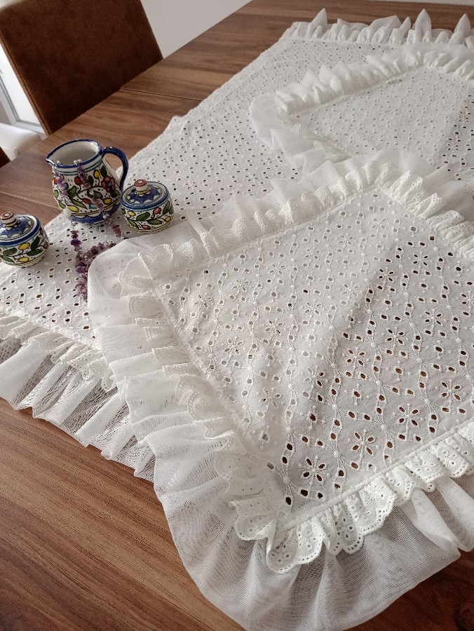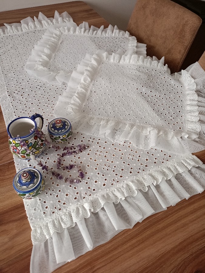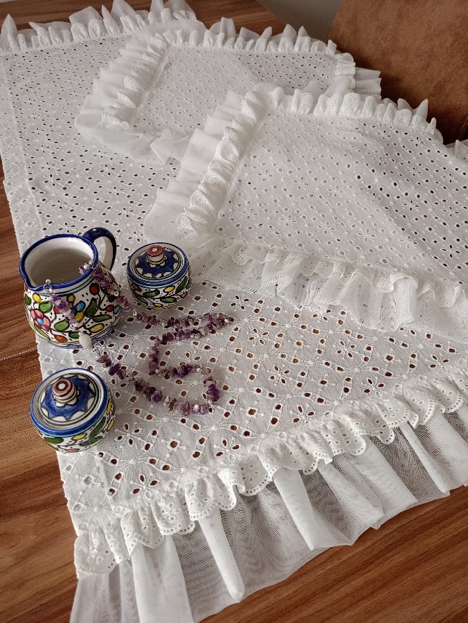 üçlü oda takımı fisto kumaştan tül ve fistolarla detaylandırılıp dikilmiştir yıkanıp dikilmiştir dikdörtgen runner 45_120 kare örtü 50_50 iki adet olmak üzere üç parçadır